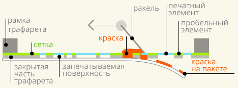 продавливания краски сквозь форму, называемую трафаретом. Он используется в виде тонкой сетки из